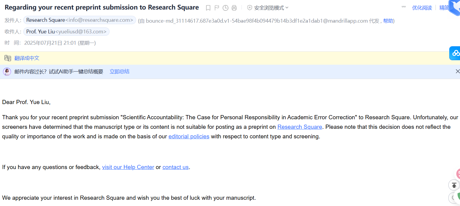 Thank you for your recent preprint submission "Scientific Accountability: The Case for Personal Responsibility in Academic Error Correction" to Research Square. Unfortunately, our screeners have determined that the manuscript type or its content is not suitable for posting as a preprint on Research Square. Please note that this decision does not reflect the quality or importance of the work and is made on the basis of our editorial policies with respect to content type and screening.